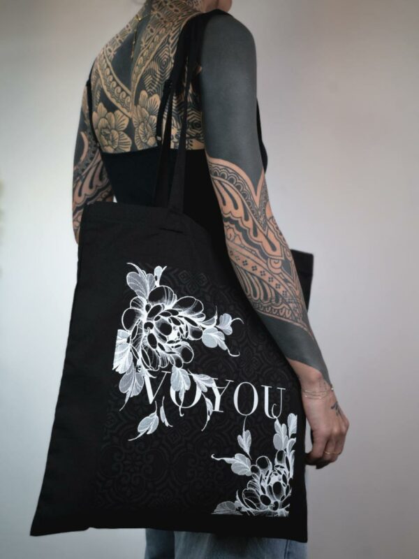 Tote bag en tissu noir avec illustration florale blanche, issu d’une collaboration entre les artistes Peaudvoyou et Remyb.